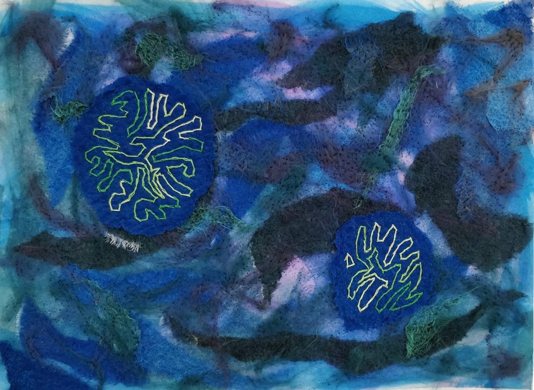 The first pieces copied the microscopic image on the left, kidney amyloids 1. Fabric was collaged onto transfer dyed felt using an embellisher. Hand embroidery was used to emphasise the amyloids.